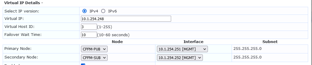 Provide High Availability in ClearPass we can use Virtual IP configuration and standby publisher methods.